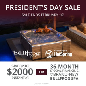 President’s Day Sale sale ends February 16! Save up to $2,000 instantly! OR 36-month special financing on a brand-new Bullfrog Spa *See store for details.